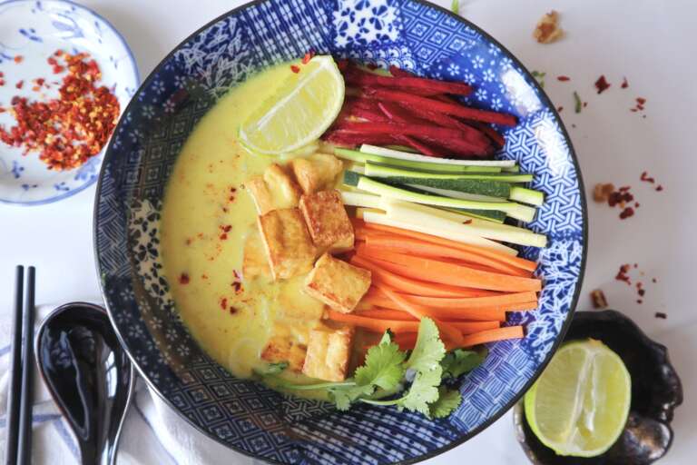 6. Ladle soup onto rice noodles or rice & garnishes according to your taste.
